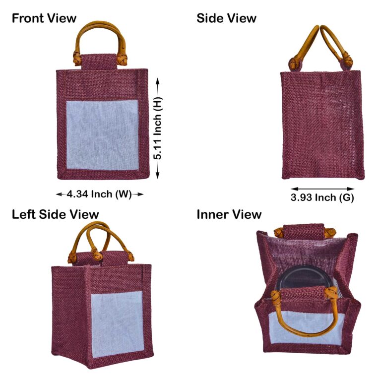 6 Natural Jute Gift Bags with PVC & Cane Handle 5.91″x5.11″x3.93″