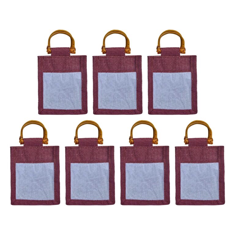 Ecojute Set of 7 Jute Gift Bags with Cane Handles & PVC Windows – Deep Red, Pink, Green, Orange- 4.92″ x 7.88″ x 4.33″