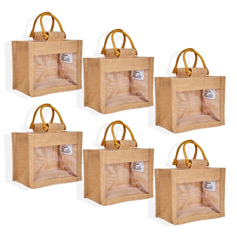 Ecojute 8 Jute Shopping Bags with PVC Window – Bridesmaid, Wedding 12″x10″x5″