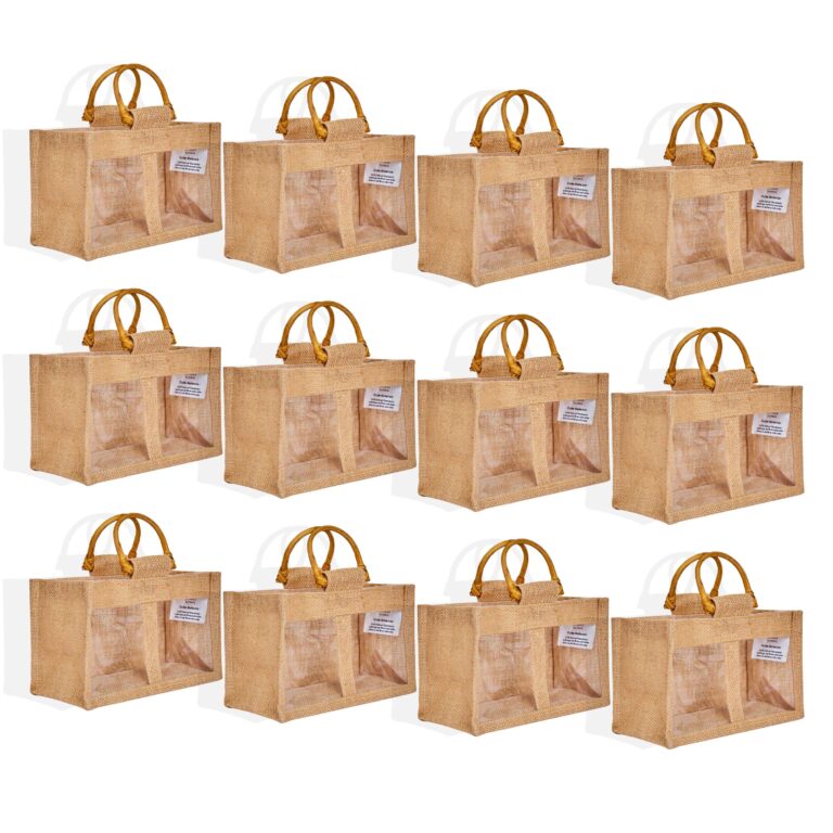 Set of 4 Juco Tote Bags– Gifting Burlap Bags with PVC Panel 10″x12″x5″