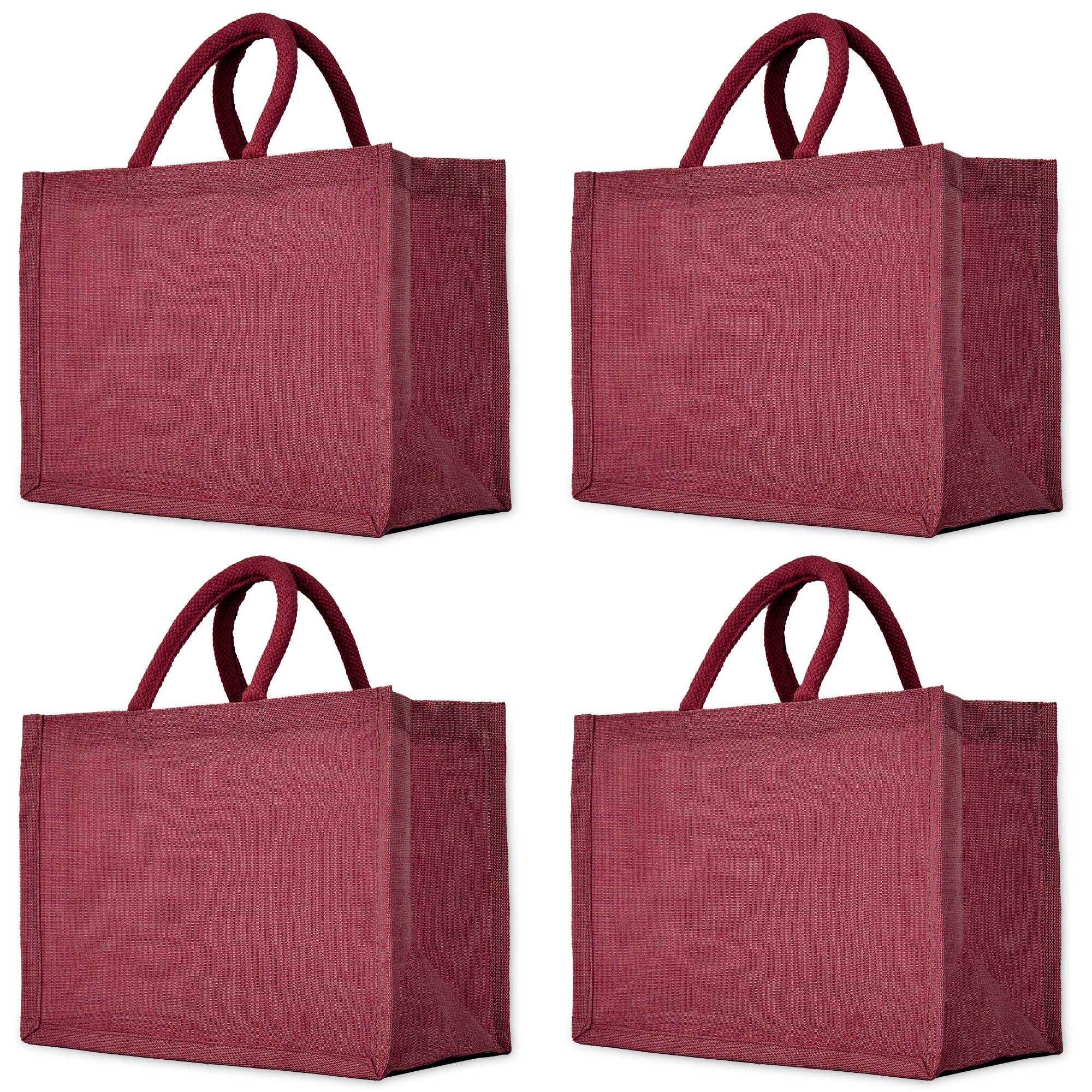 4-Pack Jute Tote Bags – Reusable 15″x12″x6″ Deep Red, Pink, Green & Orange