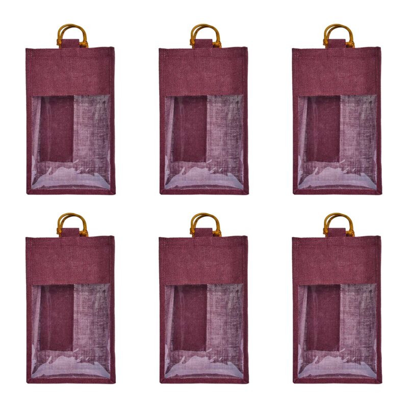 Ecojute Set of 7 Jute Gift Bags with Cane Handles & PVC Windows – Deep Red, Pink, Green, Orange- 4.92″ x 7.88″ x 4.33″