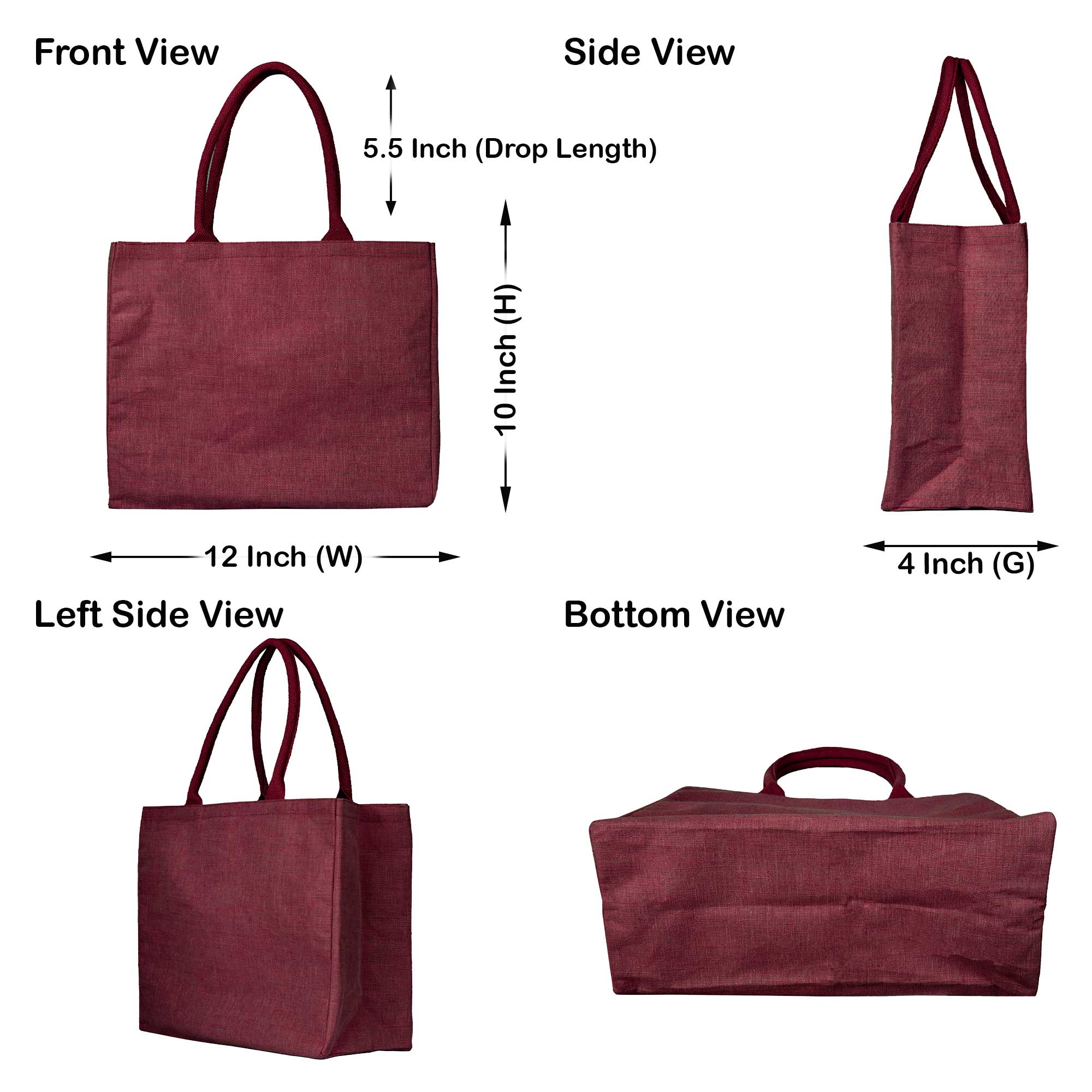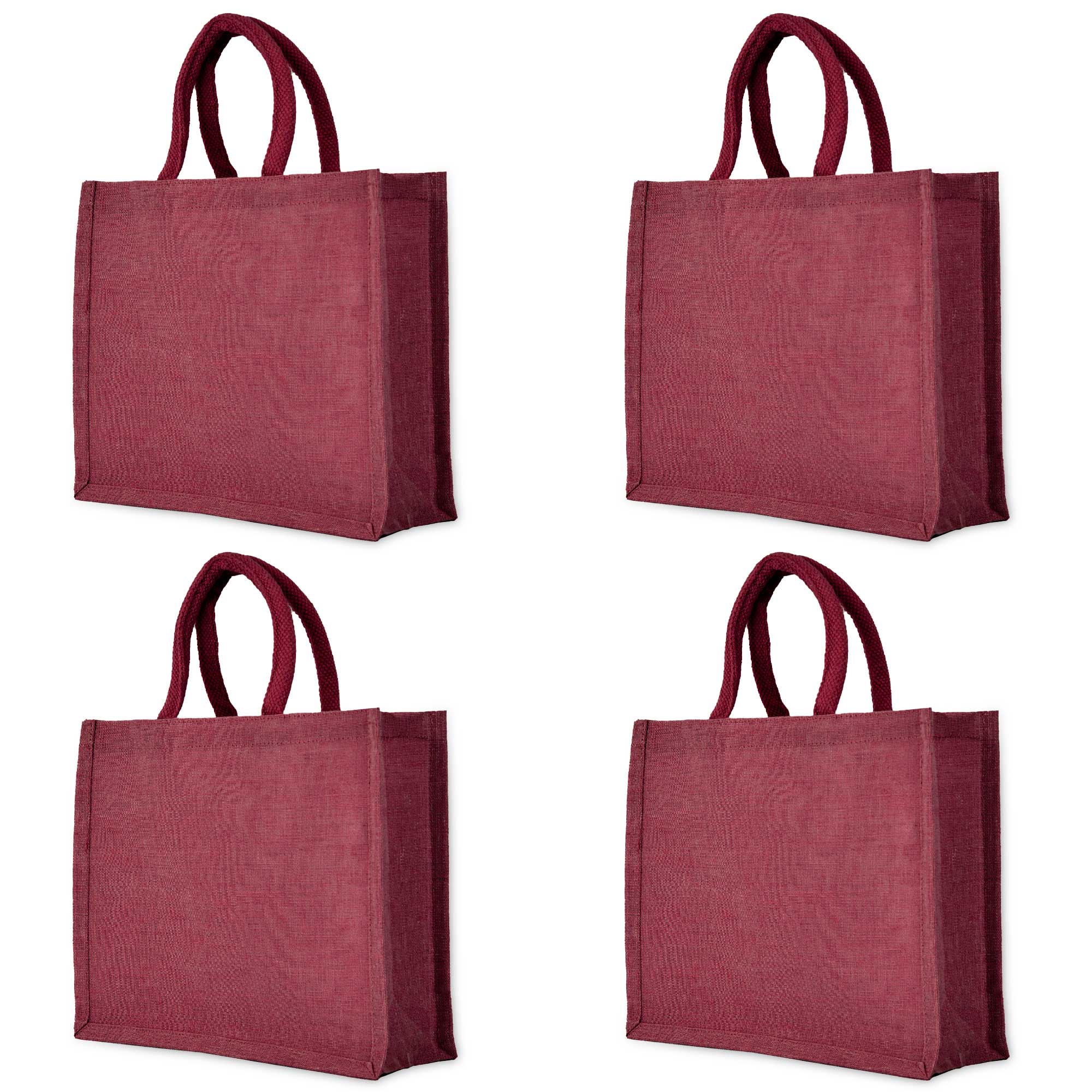 Ecojute 4-Pack Jute Tote Bags – Deep Red, Pink, Green, Orange- 10″x10″x4″