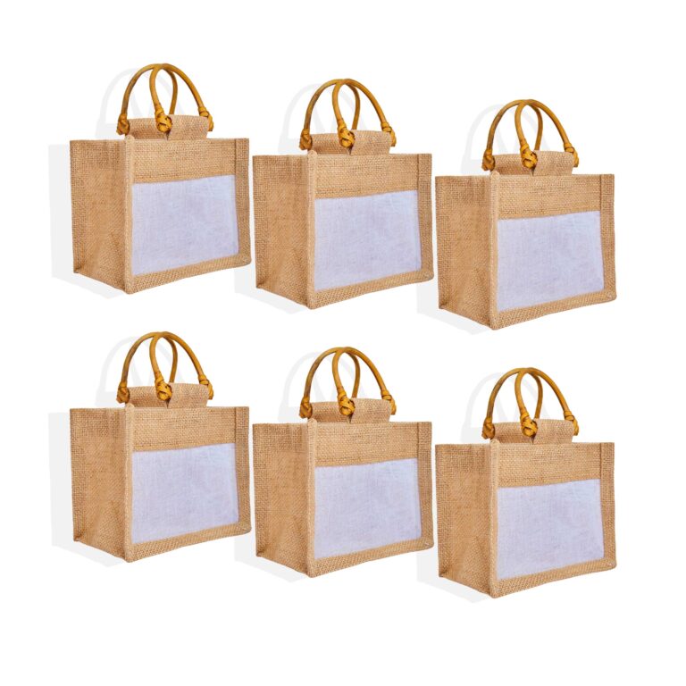 6 Natural Jute Gift Bags with PVC & Cane Handle 5.91″x5.11″x3.93″