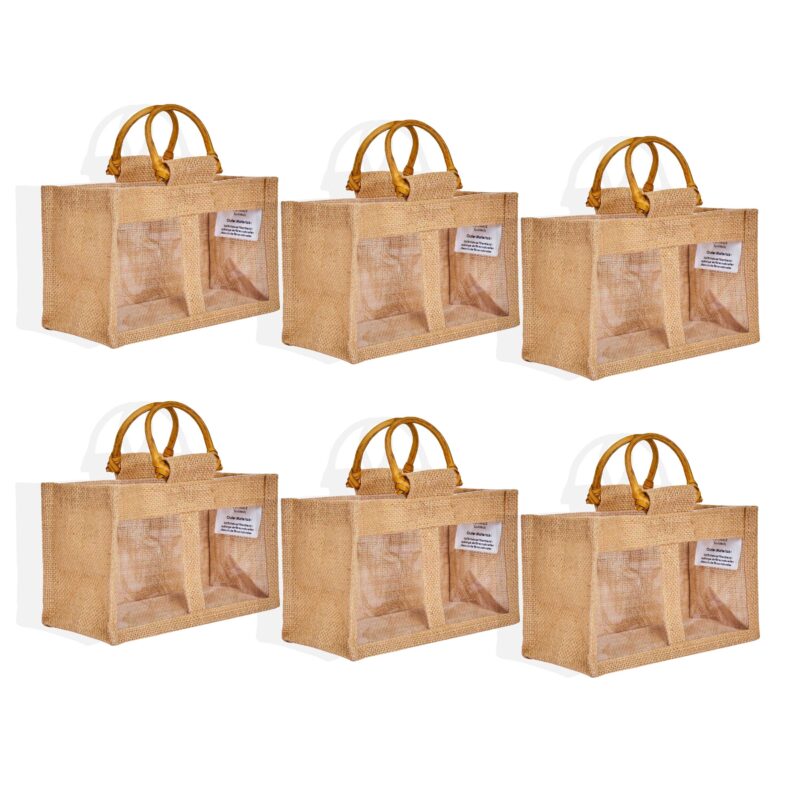 6 Jute Gift Bags with Handles & Dual PVC– 7.88″x4.92″x4.33″