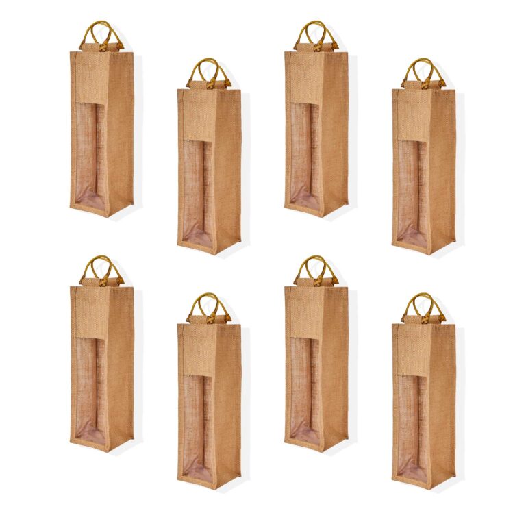 8-Pack Reusable Jute Wine Tote, 7.88″x13.38″x3.93″, Eco-Friendly Burlap Bottle Bags with Cane Handles (Holds 2 Bottles)