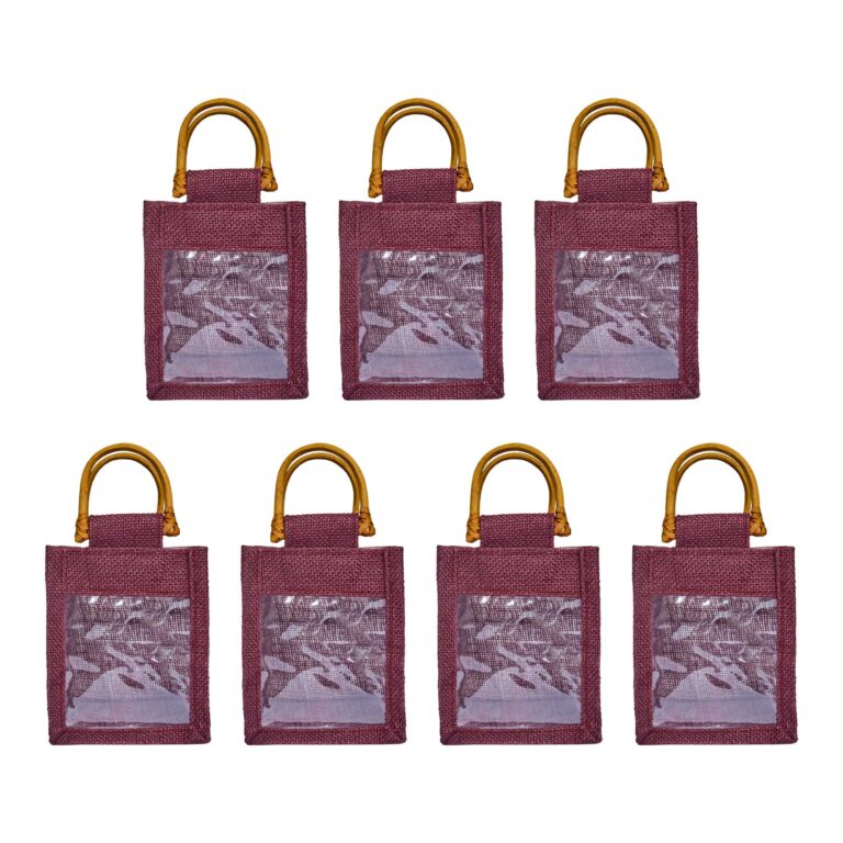 Pack of 7 Jute Gift Bags with PVC & Cane Handles– Deep Red, Pink, Green, Orange -5.11″ x 4.34″ x 3.93″