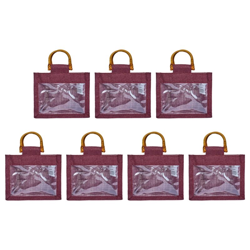 Set of 7 Jute Gift Bags with PVC & Cane Handles 5.11″ x 5.91″ x 3.93″– Deep Red, Pink, Green, Orange