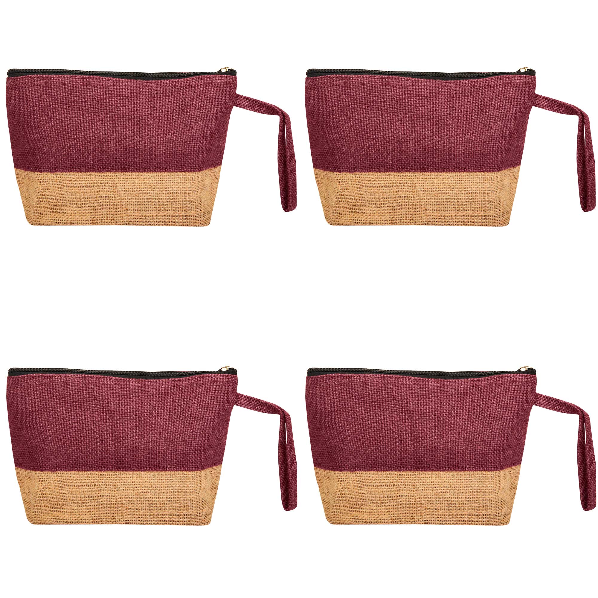 4-Pack Jute Cosmetic Bags – Deep Red, Pink, Green, Orange – 9.45″x5.9″x2.75″