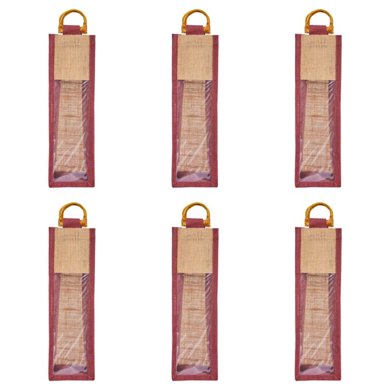 6-Pack Jute Wine Bags – Deep Red, Pink, Green, Orange with PVC & Cane Handles 13.38″ x 3.93″ x 3.93″