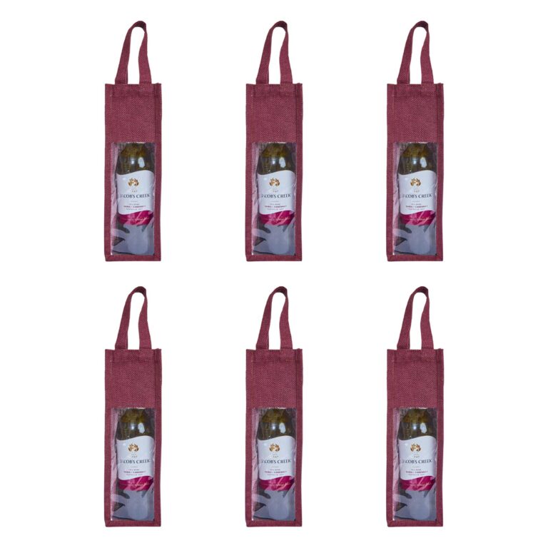 6-Pack Jute Wine Bags with Flat Handles & PVC – Deep Red, Pink, Green, Orange- 13.38″ x 3.93″ x 3.93″