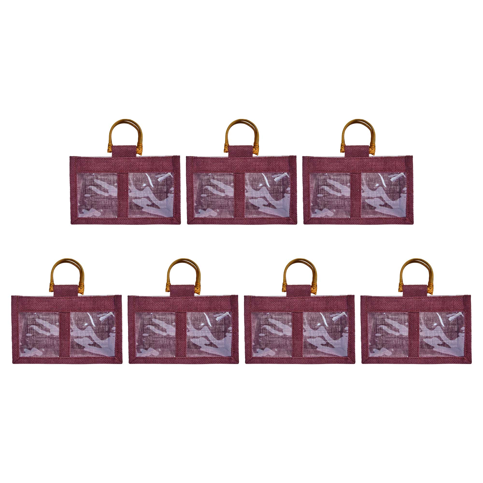 Ecojute Set of 7 Jute Gift Bags with Cane Handles & PVC Windows – Deep Red, Pink, Green, Orange- 4.92″ x 7.88″ x 4.33″