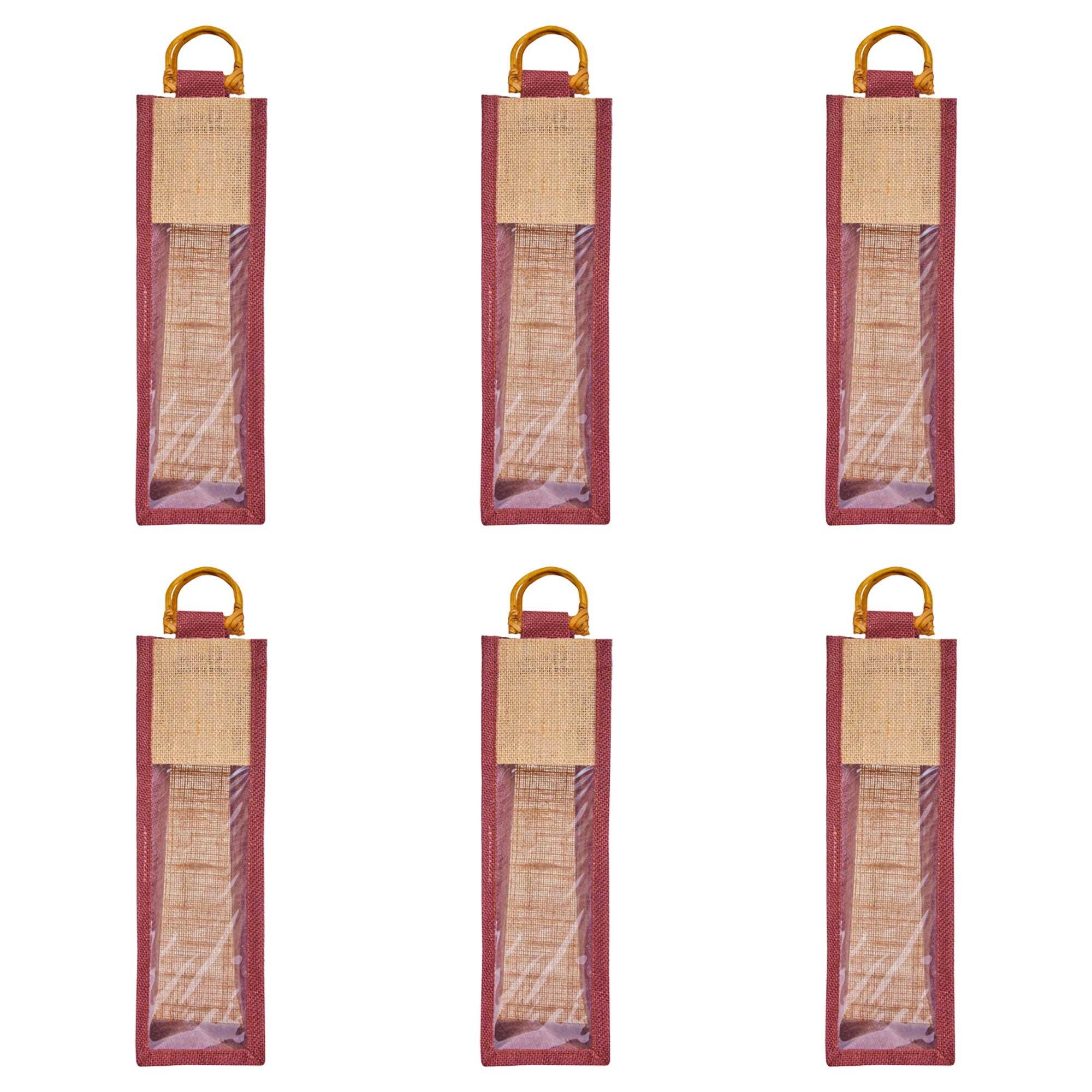 6-Pack Jute Wine Bags – Deep Red, Pink, Green, Orange with PVC & Cane Handles 13.38″ x 3.93″ x 3.93″