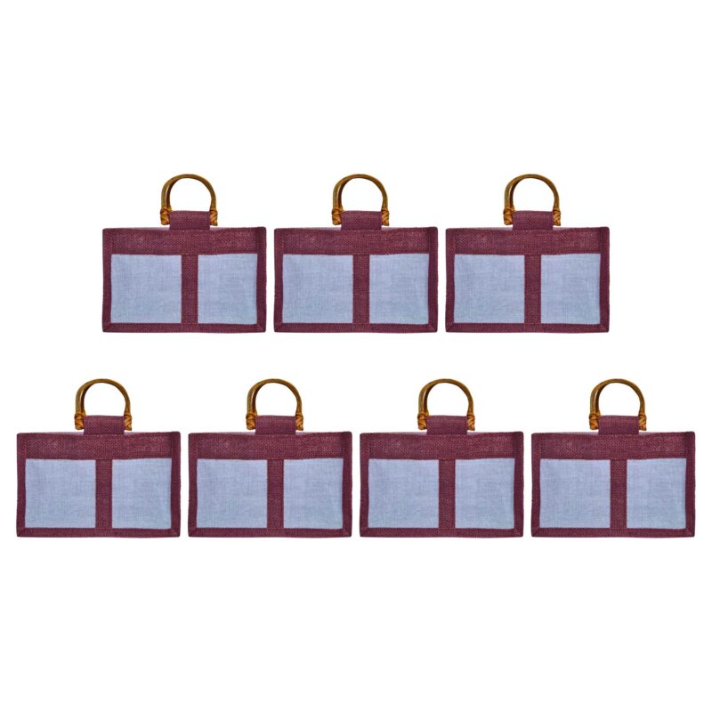 Ecojute Set of 7 Jute Gift Bags with Cane Handles & PVC Windows – Deep Red, Pink, Green, Orange- 4.92″ x 7.88″ x 4.33″