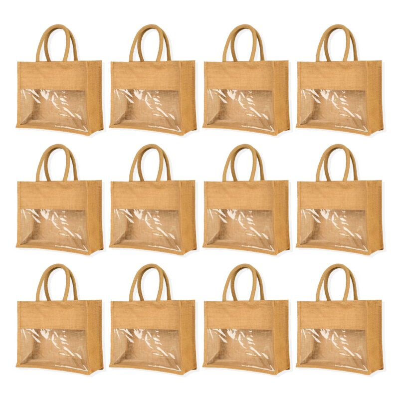 Set of 12 Jute Tote Bags with PVC – Gifts for Events, Weddings, 12″Lx10″Hx5″W