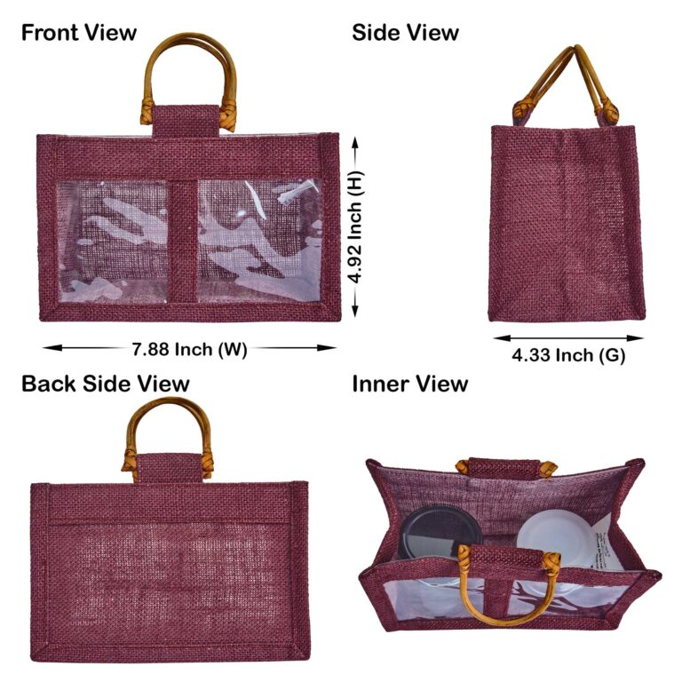 Ecojute Set of 7 Jute Gift Bags with Cane Handles & PVC Windows – Deep Red, Pink, Green, Orange- 4.92″ x 7.88″ x 4.33″