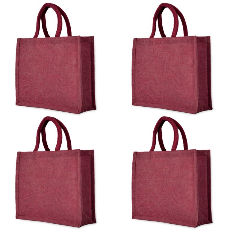 Ecojute Set of 4 Jute Tote Bags in Deep Red, Pink, Green & Orange – 14″x12″x7″