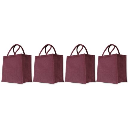 4 Jute Reusable Shopping Bags – Deep Red, Pink, Green, Orange 12″x12″x8″