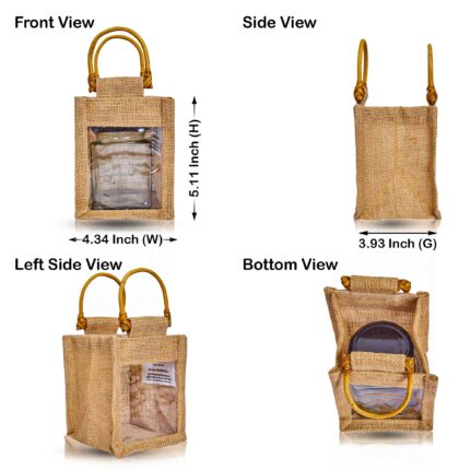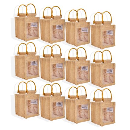 6 Natural Jute Gift Bags with PVC & Cane Handle 5.91″x5.11″x3.93″