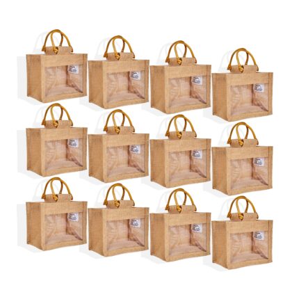 6 Jute Gift Boxes with Drawstring & PVC – 6.3″x4.33″x2.36″
