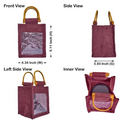 Pack of 7 Jute Gift Bags with PVC & Cane Handles– Deep Red, Pink, Green, Orange -5.11″ x 4.34″ x 3.93″